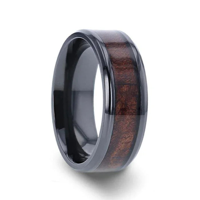 CERISE Redwood Inlaid Black Ceramic Ring with Beveled Edges - 8mm