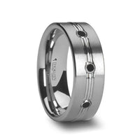 ROYALE Satin Finished Tungsten Ring with Polished Grooved Center and Triple Black Diamonds - 8mm