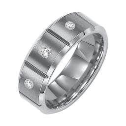 PIERCE Beveled Satin Finish Tungsten Carbide Wedding Band with Bright Horizontal V Cuts and Three Diamond Settings by Triton Rings - 8 mm