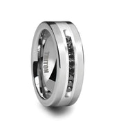 RIDLEY Beveled Tungsten Carbide Wedding Band with Black Carbon Fiber Inlay and Three Channel Set Diamonds by Triton Rings - 8 mm