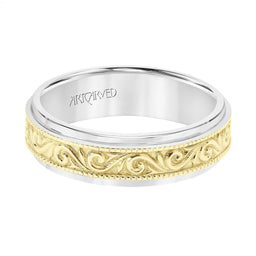 14k Two Toned White & Yellow Gold Wedding Band Raised Paisley Inlay Design Milgrain Detail Round Edges- 6.5 mm