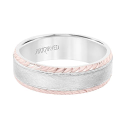 14k Two Toned White & Rose Gold Wedding Band Domed Crystalline Finish with Milgrain and Leaf Design Beveled Edges- 7 mm