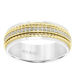 14k Two Toned White & Yellow Gold Wedding Band Dual Rope Diamond Inlay Polished Finish Flat Edges - 7 mm