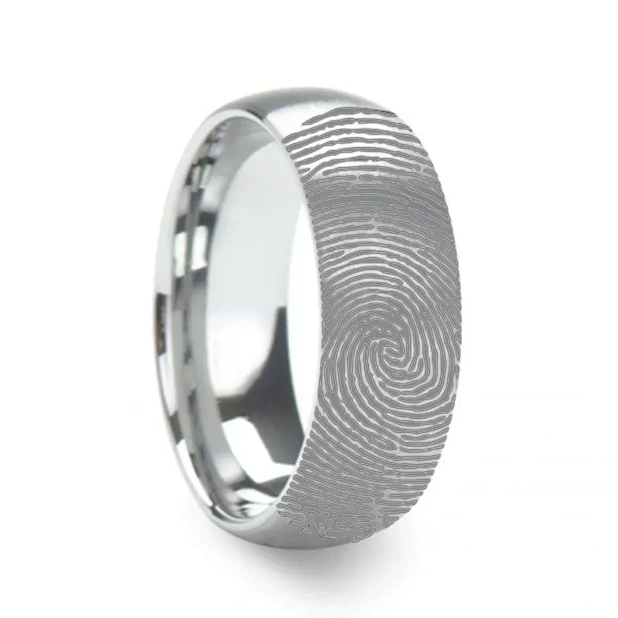 Anillo de oro blanco de 10 quilates con huella dactilar, grabado, banda abovedada cepillada (4 mm - 8 mm)