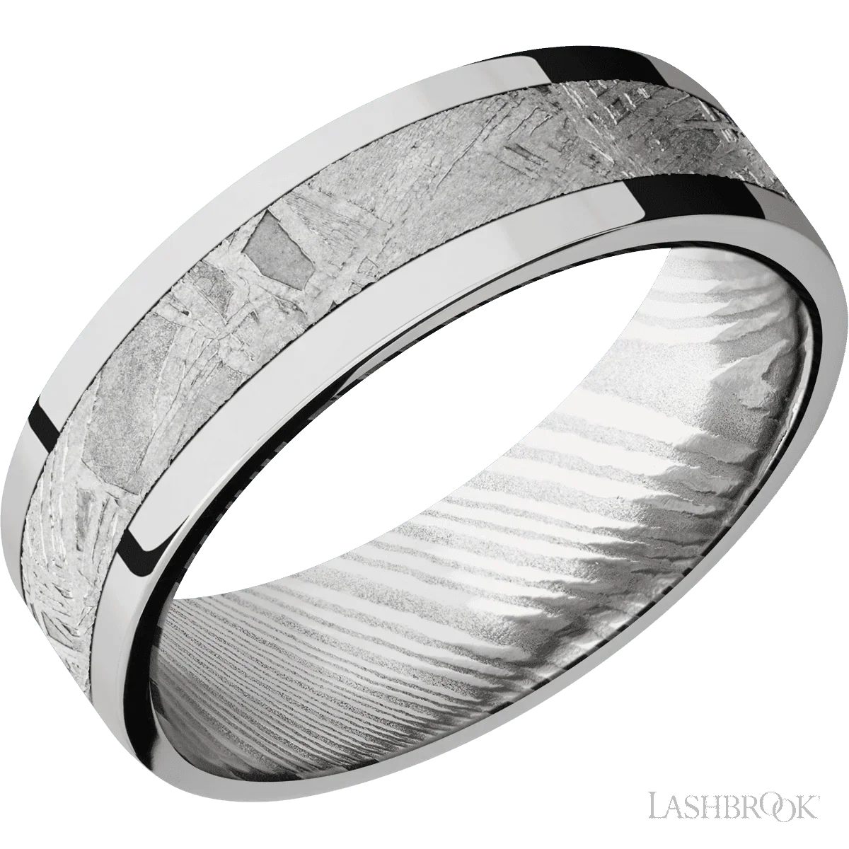 Oro blanco de 10 quilates con acabado pulido e incrustaciones de meteorito y damasco - 7 mm