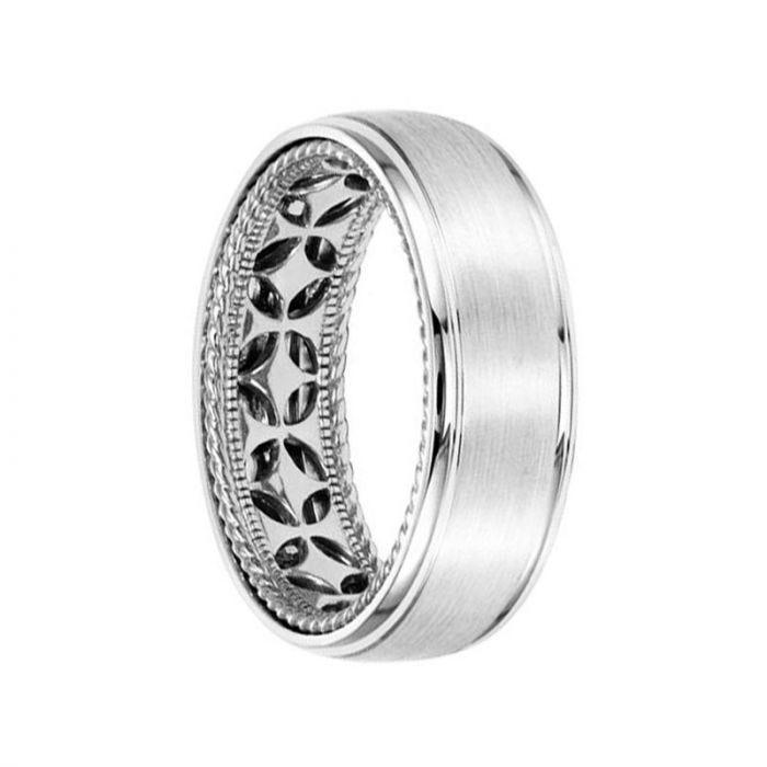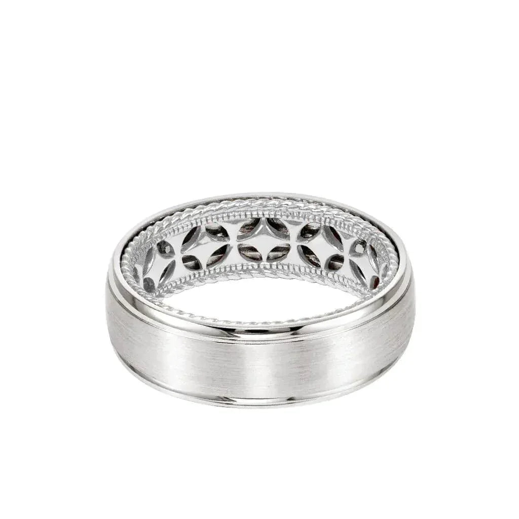 Alianza de boda de oro blanco de 14 k con diseño de diamantes, borde interior tipo cuerda, acabado cepillado abovedado y bordes redondeados de Artcarved (7 mm)