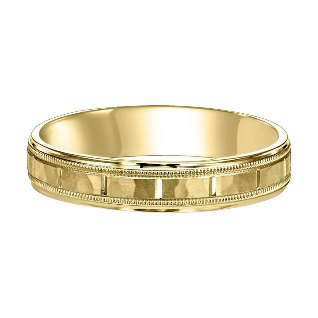 Anillo de bodas para mujer en oro amarillo de 14k con acabado satinado martillado y milgrain - 4,5 mm - 6,5 mm - 8,5 mm. Consolide su amor y compromiso con un anillo de bodas tan especial como su unión. Este anillo contemporáneo está moldeado en oro amarillo de 14k y presenta un acabado satinado martillado. El centro está detallado con cortes verticales y milgrain a ambos lados. Los brillantes bordes pulidos realzan la pieza. Este anillo tiene un ajuste cómodo y está disponible en anchos de 4,5 mm, 6,5 mm y 8,5 mm. También está disponible en oro blanco de 14k. Puede encontrar anillos similares a este estilo en nuestra colección de anillos de boda con milgrain. Larson Jewelers se enorgullece de ofrecer una variada colección de anillos de boda en oro de 14k. El oro es uno de los metales más deseados del mercado y un clásico para la joyería nupcial. Nuestros anillos de boda están disponibles en una variedad de estilos, anchos y acabados, lo que los convierte en una excelente opción tanto para hombres como para mujeres.
