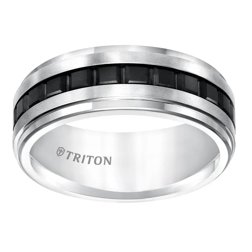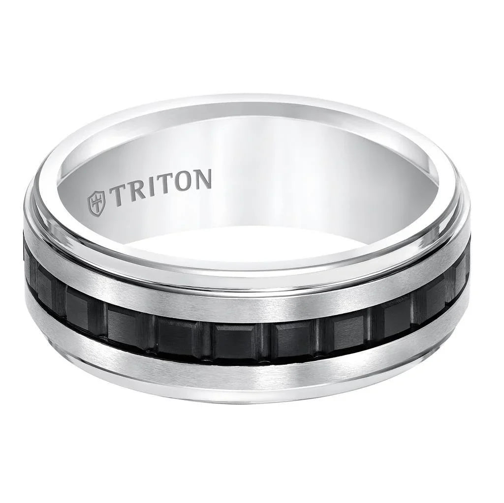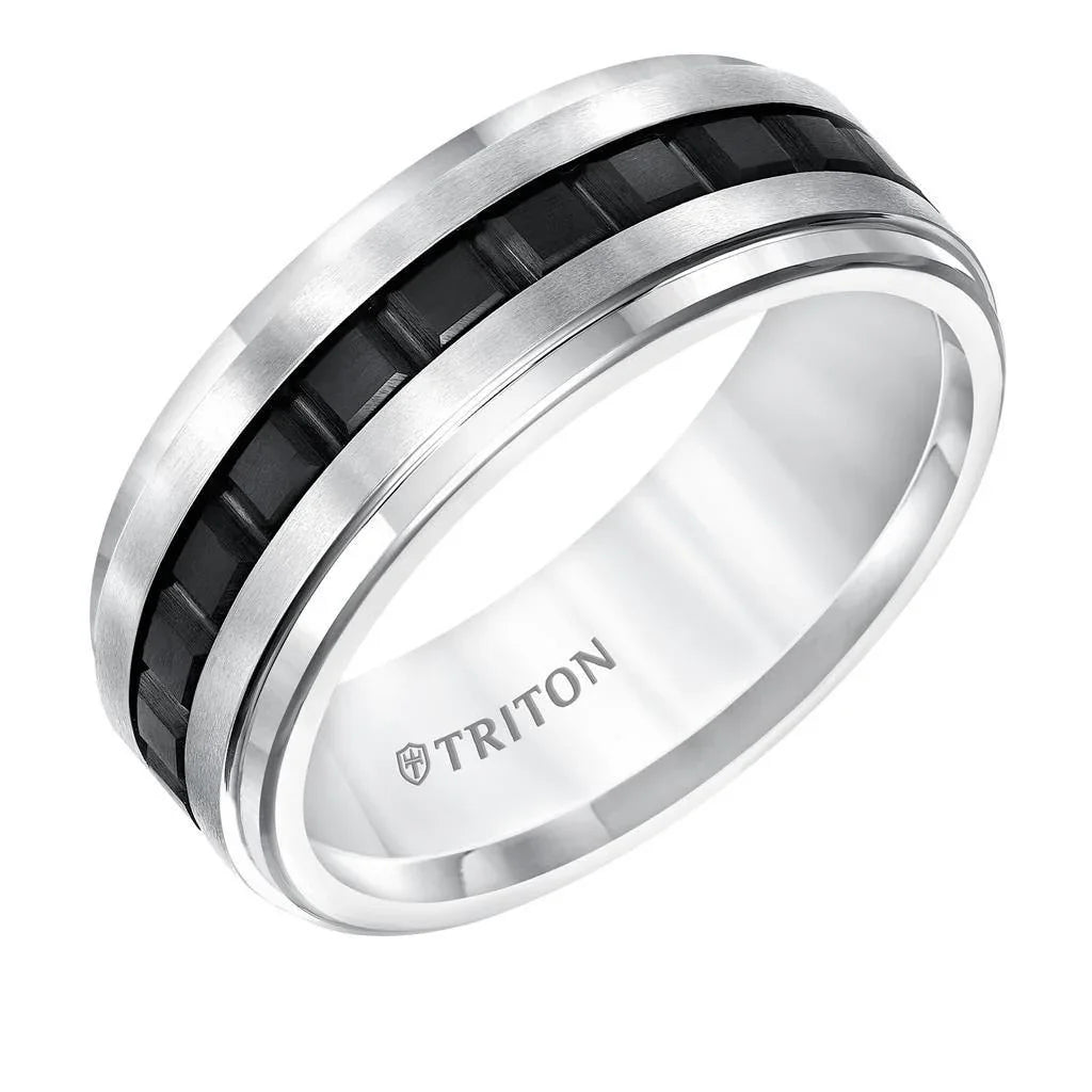 Banda de tungsteno de 8 mm con borde escalonado, plana, en blanco y negro, con ajuste cómodo y textura central