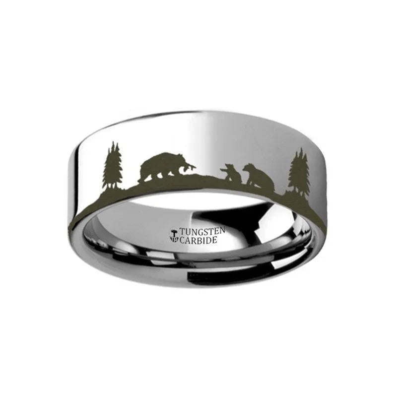 Anillo de tungsteno plano grabado con escena de paisaje animal, osos y oseznos (4 mm - 12 mm)