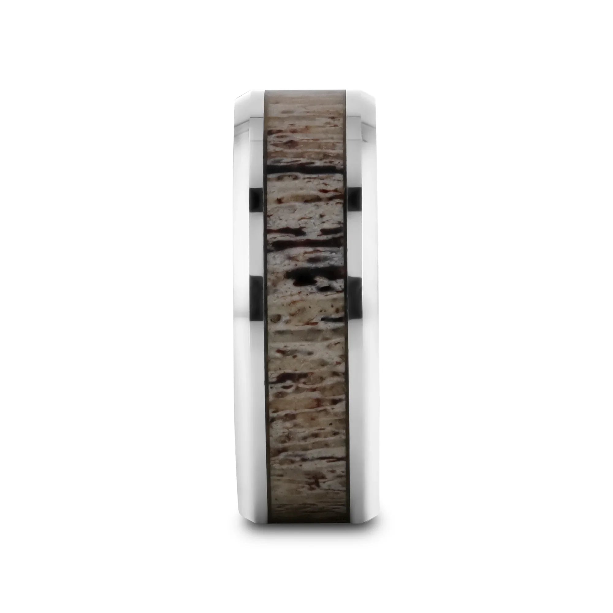 Alianza de boda BUCK de carburo de tungsteno pulido y biselado para hombre con incrustaciones de asta de ciervo en degradado (6 mm y 8 mm)