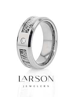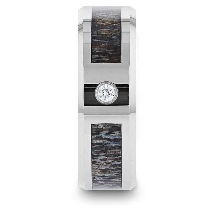 Este hermoso anillo de tungsteno pulido y biselado de Thorsten presenta una incrustación de asta de ciervo con detalles en tonos marrón oscuro y gris, y un distintivo diamante blanco de talla redonda de 0,05 quilates. ¡Una opción perfecta para quienes aman la naturaleza!