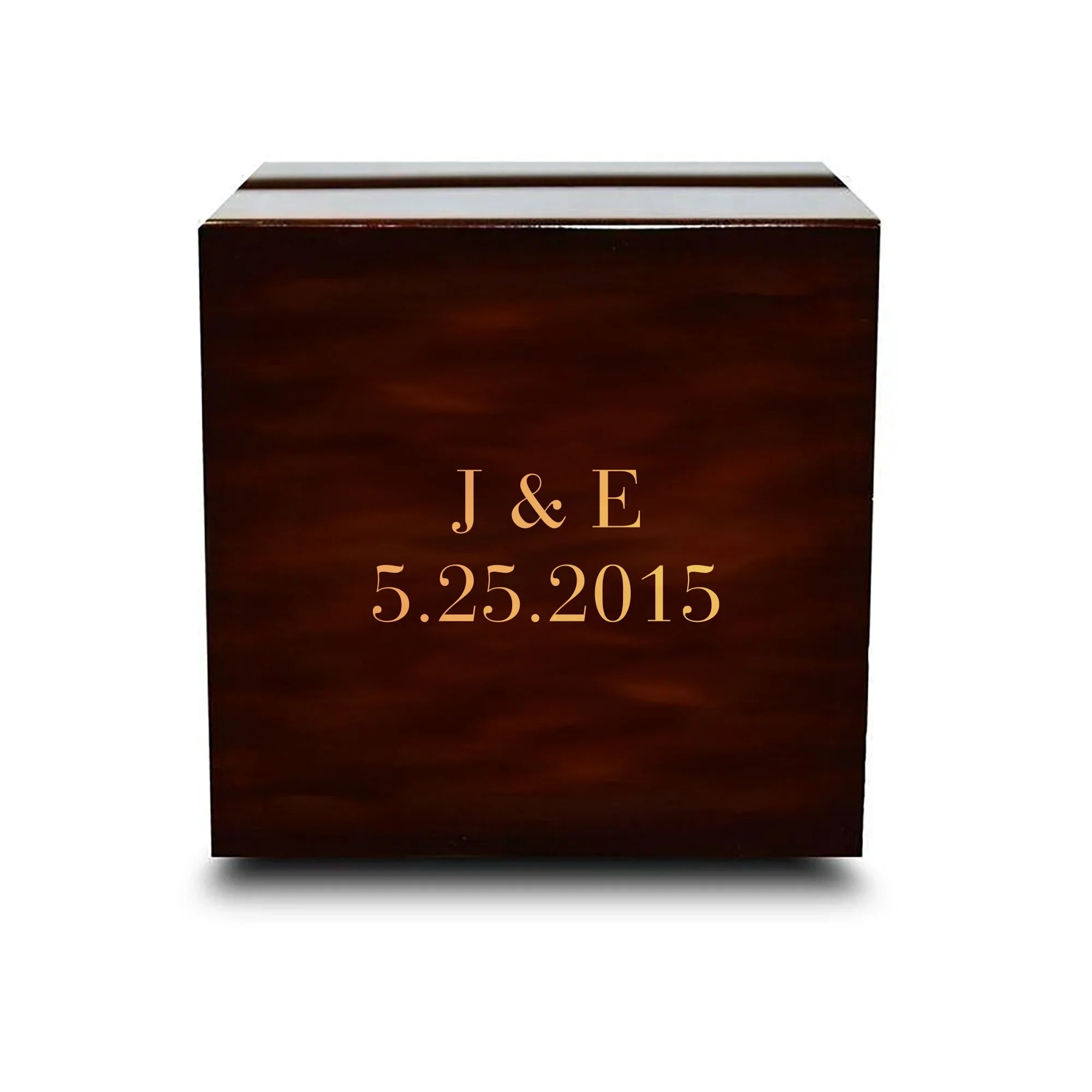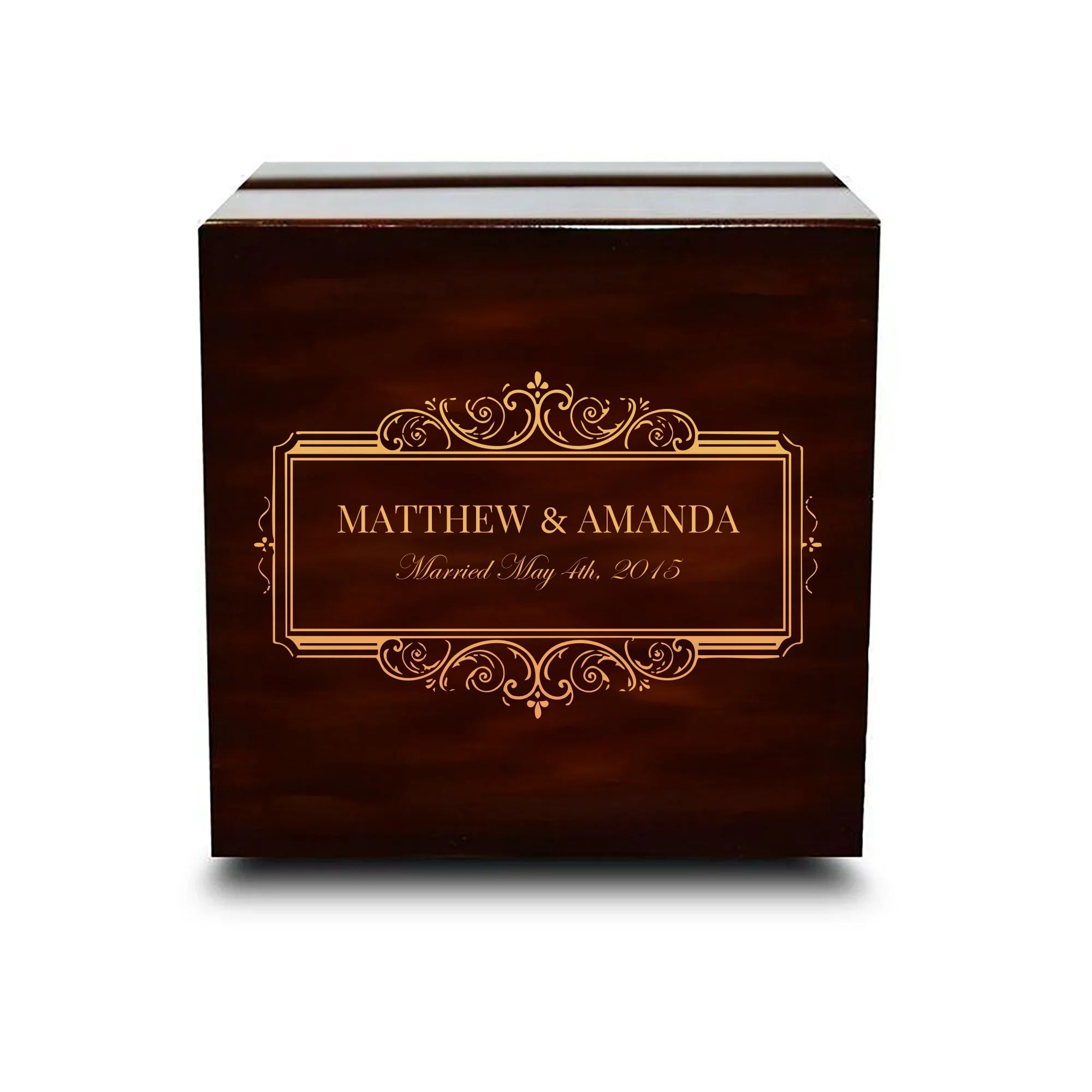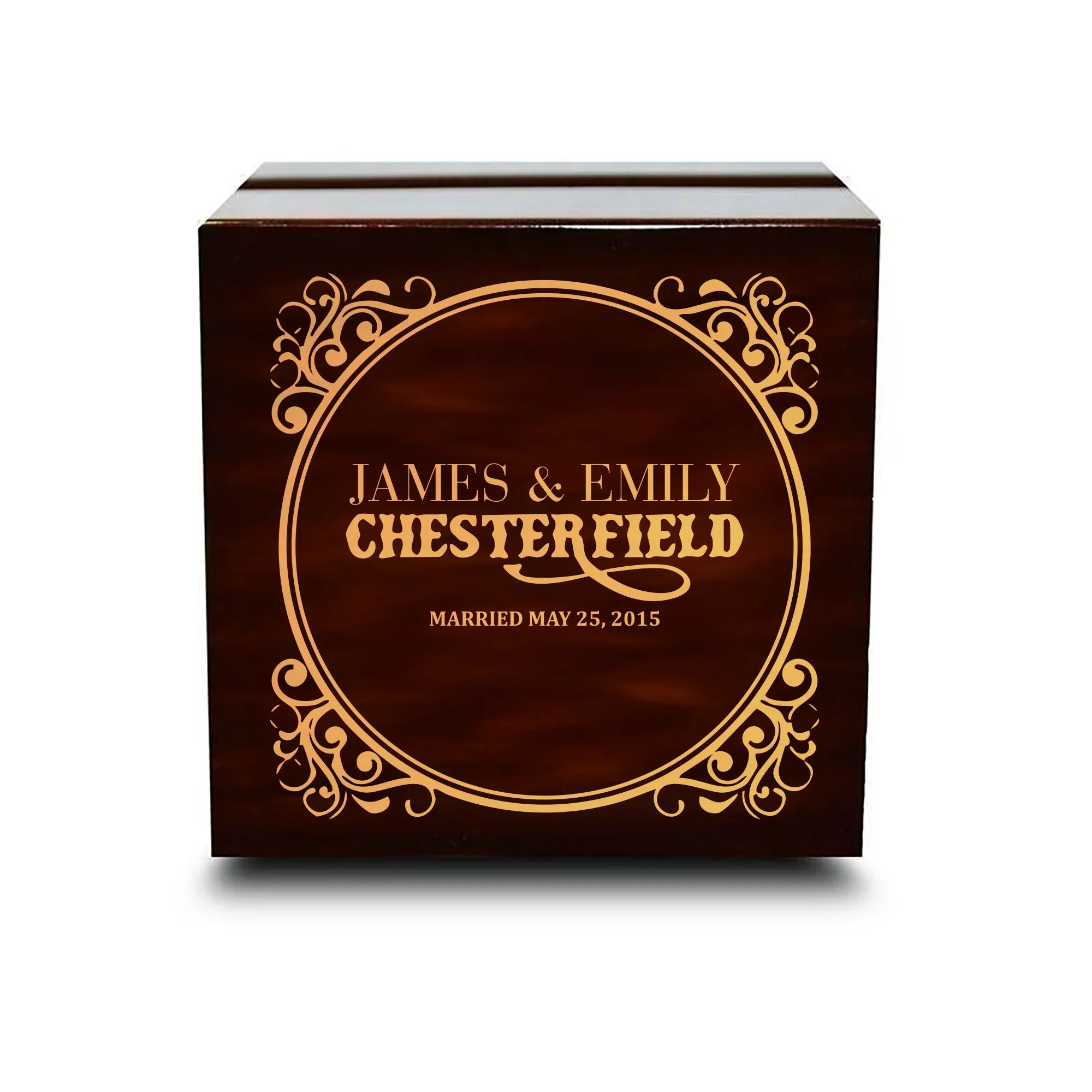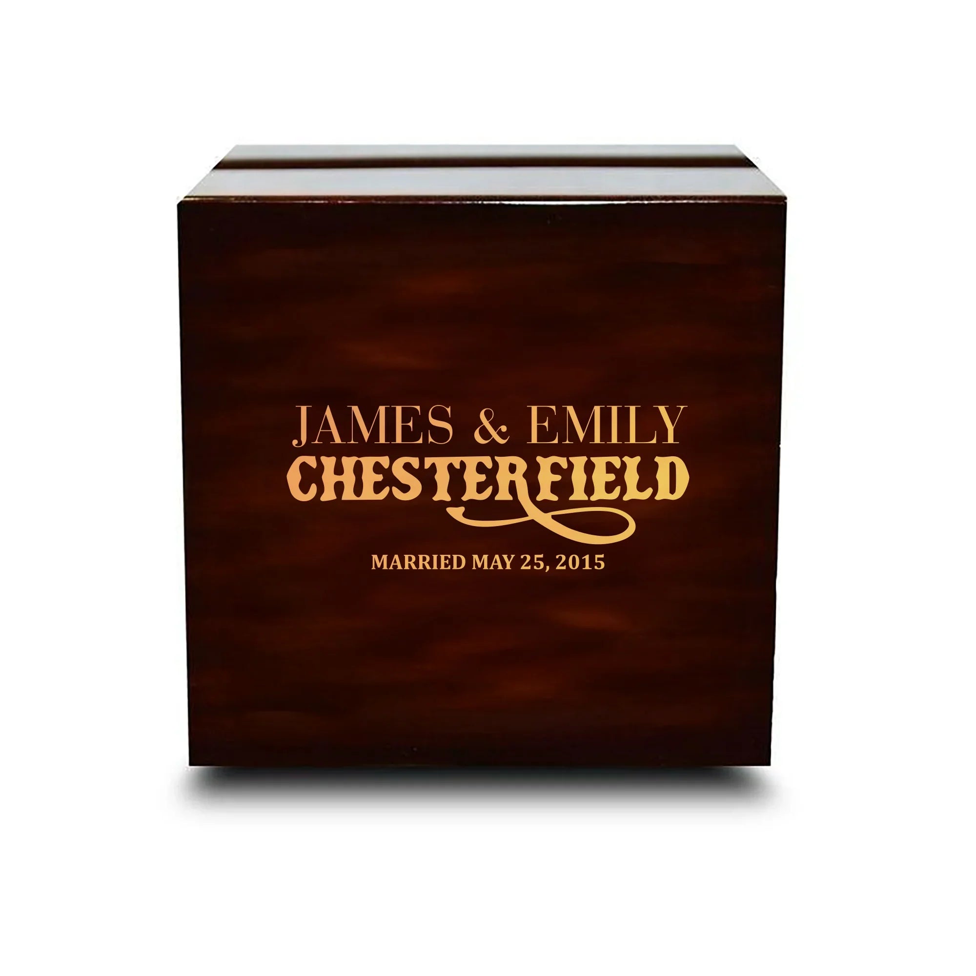 Caja para anillos de boda de madera oscura con grabado personalizado de chocolate