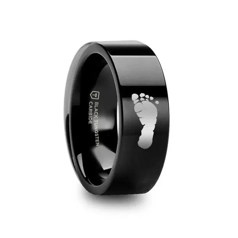 Personalice este anillo de precisión de nuestra línea de anillos de carburo de tungsteno negro Comfort Fit con la huella de su pie o el de su ser querido. Las huellas se pueden grabar en el interior o el exterior de la banda; todas las huellas se graban en el exterior, a menos que se indique específicamente en las notas de su pedido. Este atractivo anillo de bodas de tungsteno tiene un acabado pulido para quienes prefieren acabados brillantes. Su exclusivo acabado pulido le confiere elegancia.