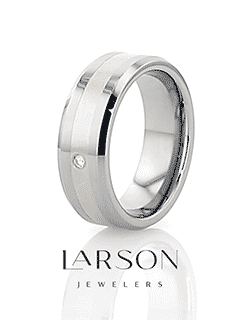 Este hermoso diseño de anillo de bodas de carburo de tungsteno de Thorsten presenta una incrustación de 3 mm de ancho de paladio blanco natural y un solo diamante de 0,04 ct engastado en la incrustación.