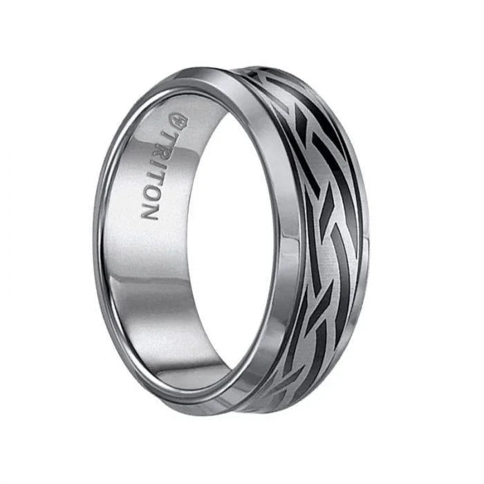 Alianza de boda de carburo de tungsteno cóncava y biselada con grabado de nudo celta y detalles negros de Triton Rings (8 mm)