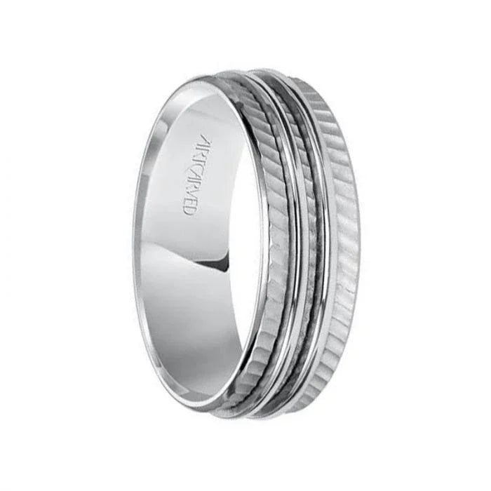 Alianza de bodas LUCAS de oro blanco de 14 k con diseño de patrón diagonal plano y doble cresta central, acabado cepillado - 7 mm
