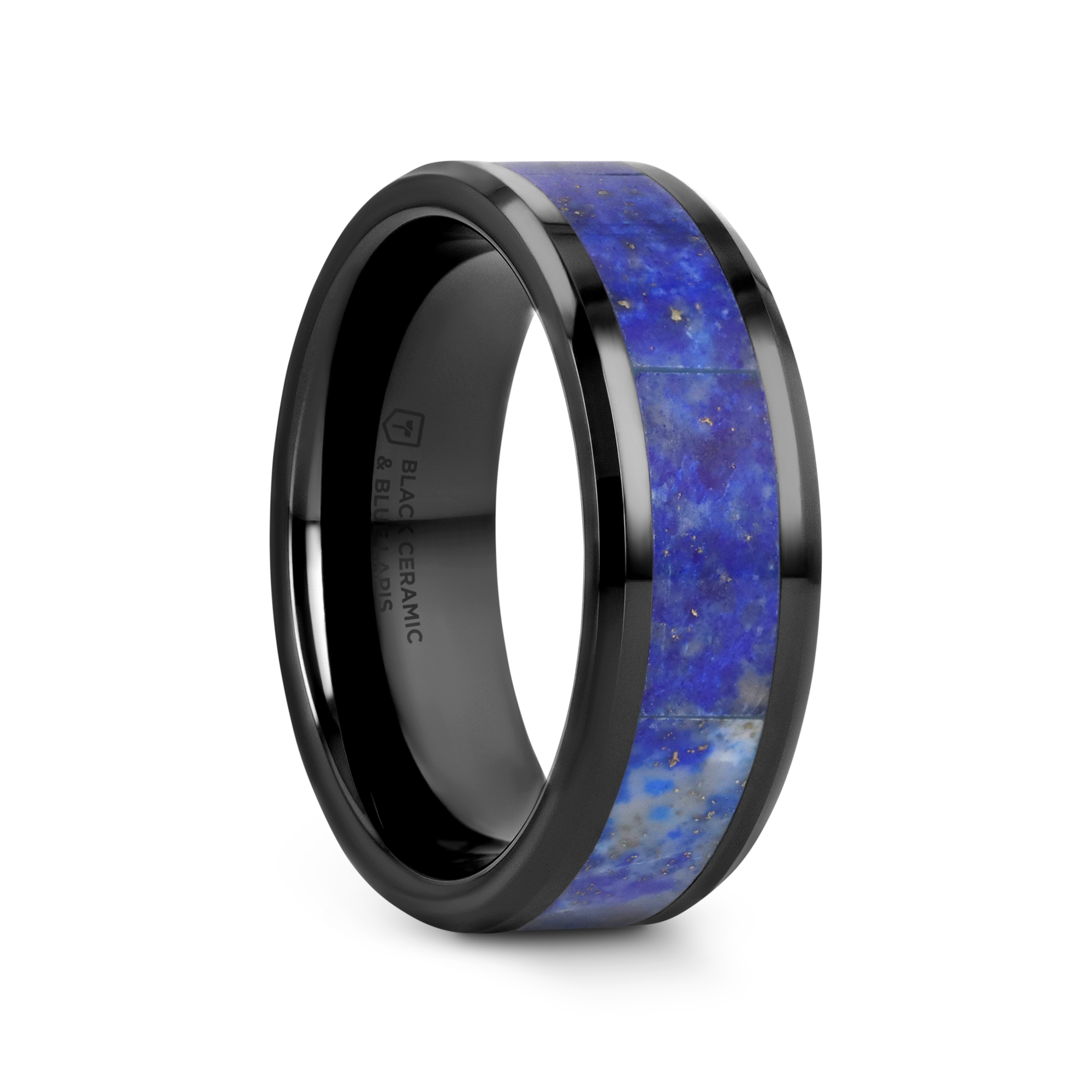 Alianza de boda MARLOW de cerámica negra pulida para hombre con incrustaciones de lapislázuli azul y bordes biselados (8 mm)