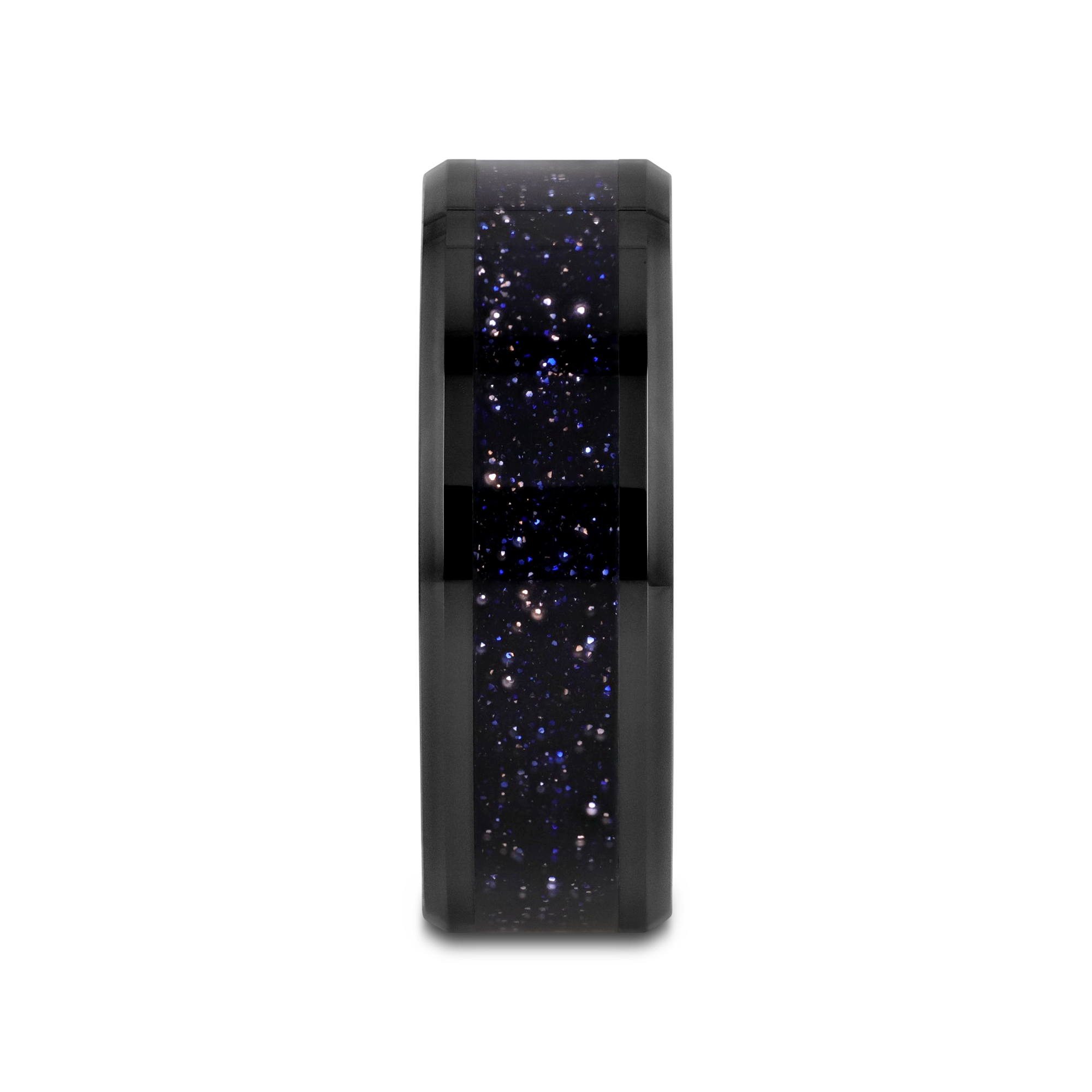 Este hermoso diseño de anillo de bodas de cerámica negra con bordes biselados de Thorsten presenta una brillante incrustación de piedra dorada púrpura sintética, una gema de vidrio hecha a mano que está rellena de cobre metálico y que a menudo se considera una piedra de protección que repele la energía negativa.