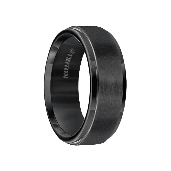 Banda MURPHY de carburo de tungsteno negro con borde escalonado y ajuste cómodo con centro de satén de Triton Rings - 8 mm