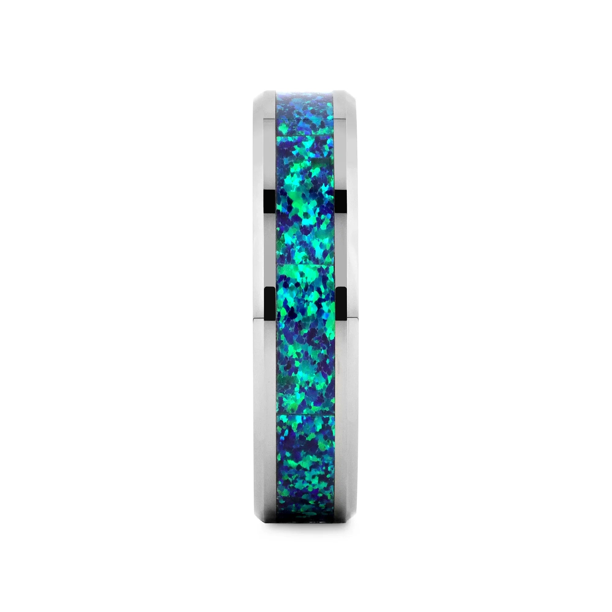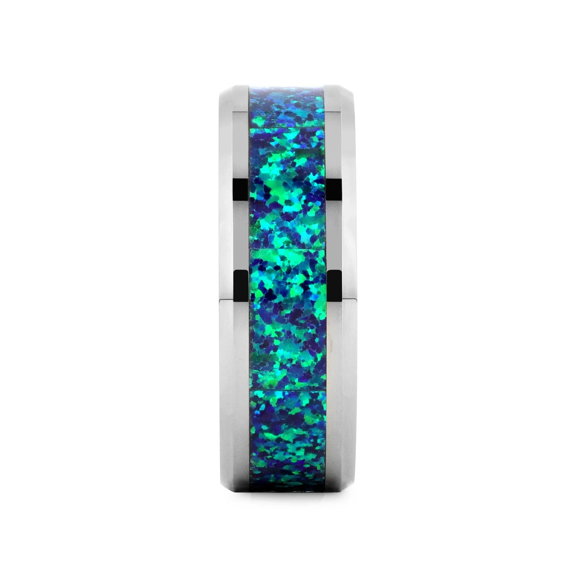 Con una incrustación de ópalo verde esmeralda brillante y de ensueño y de color azul zafiro, este fascinante anillo de carburo de tungsteno de Thorsten con bordes biselados pulidos seguramente impresionará a cualquiera que lo vea y desee verlo una y otra vez.