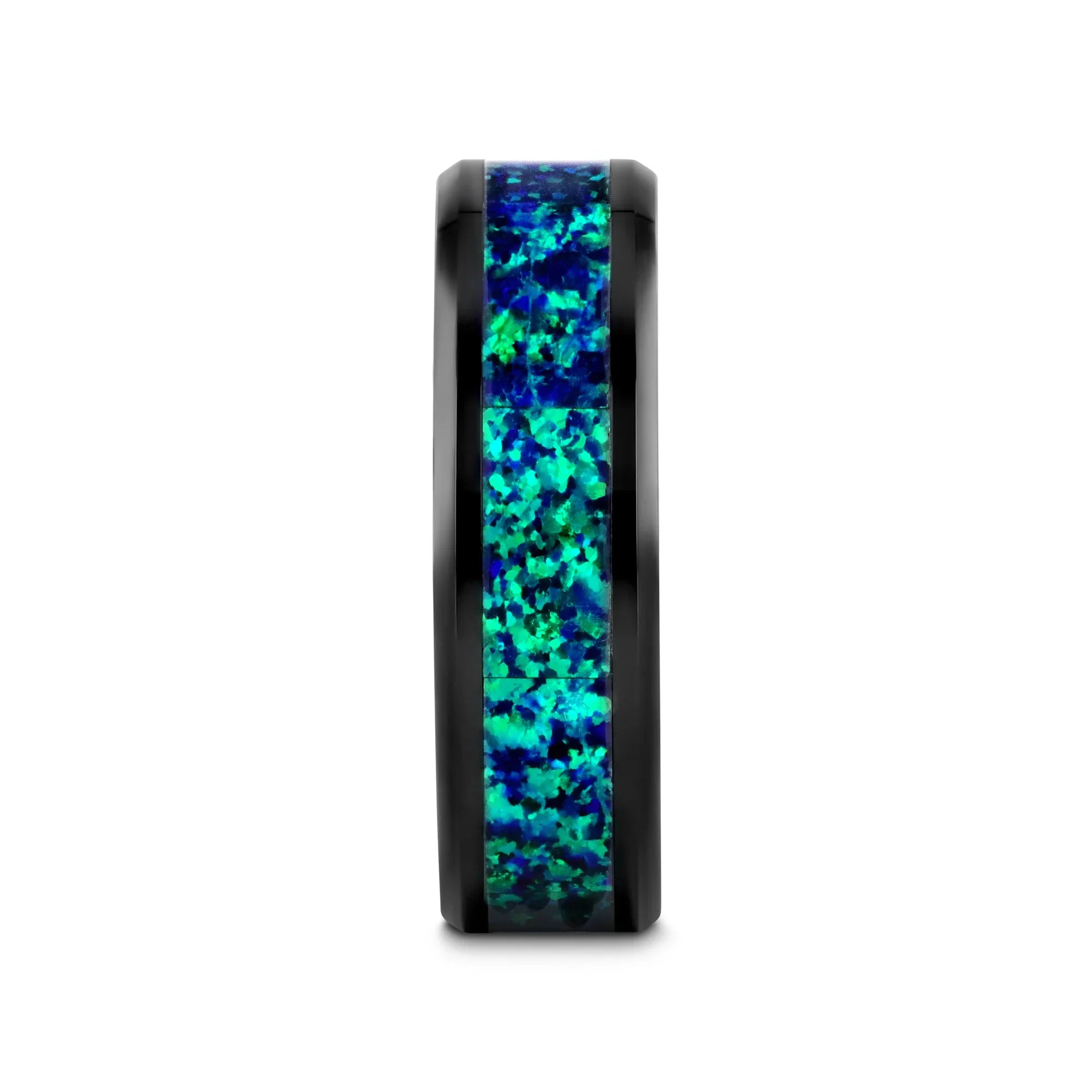 Enmarcado por una banda de cerámica negra elegantemente simple, usted y los admiradores de este anillo de Thorsten pueden perderse en la exótica maraña de deslumbrantes incrustaciones de ópalo de color verde esmeralda y azul zafiro de este anillo increíblemente hermoso.