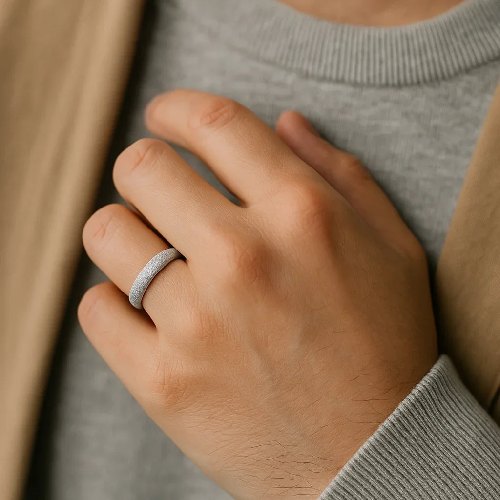 Este exclusivo anillo de carburo de tungsteno de Thorsten presenta un acabado arenado que le da al anillo un aspecto brillante como si su superficie estuviera incrustada con pequeños cristales brillantes.