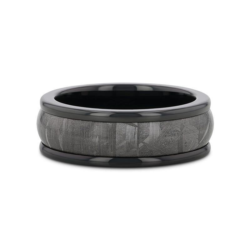 Alianza de boda de tungsteno negro DOUGIE con inserto de meteorito y borde redondo de 8 mm