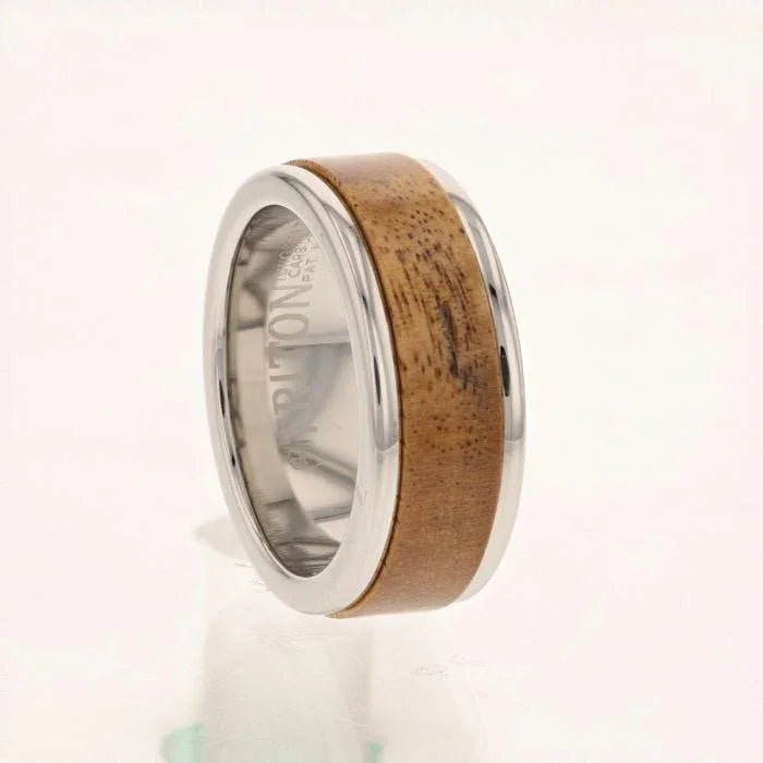 Anillo de carburo de tungsteno blanco de 8 mm con centro de madera y borde redondeado