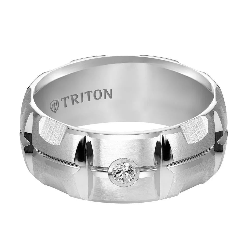 Alianza de boda de carburo de tungsteno blanco abovedado con centro de patrón de matriz y engaste de diamante solitario de Triton Rings - 9 mm