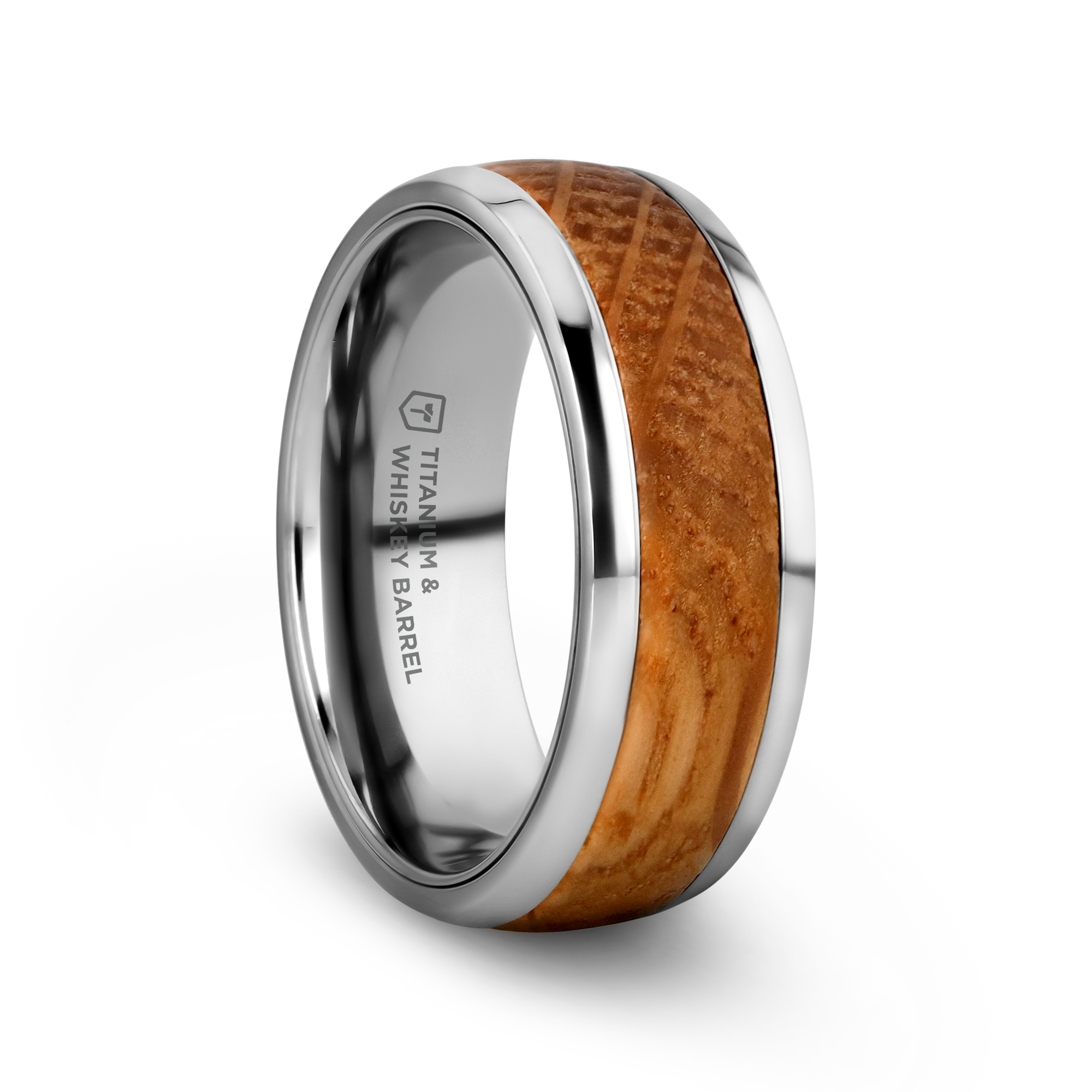 Alianza de boda STAVE de titanio con incrustaciones de barril de whisky y bordes pulidos abovedados, hecha de barriles de whisky auténticos (8 mm)