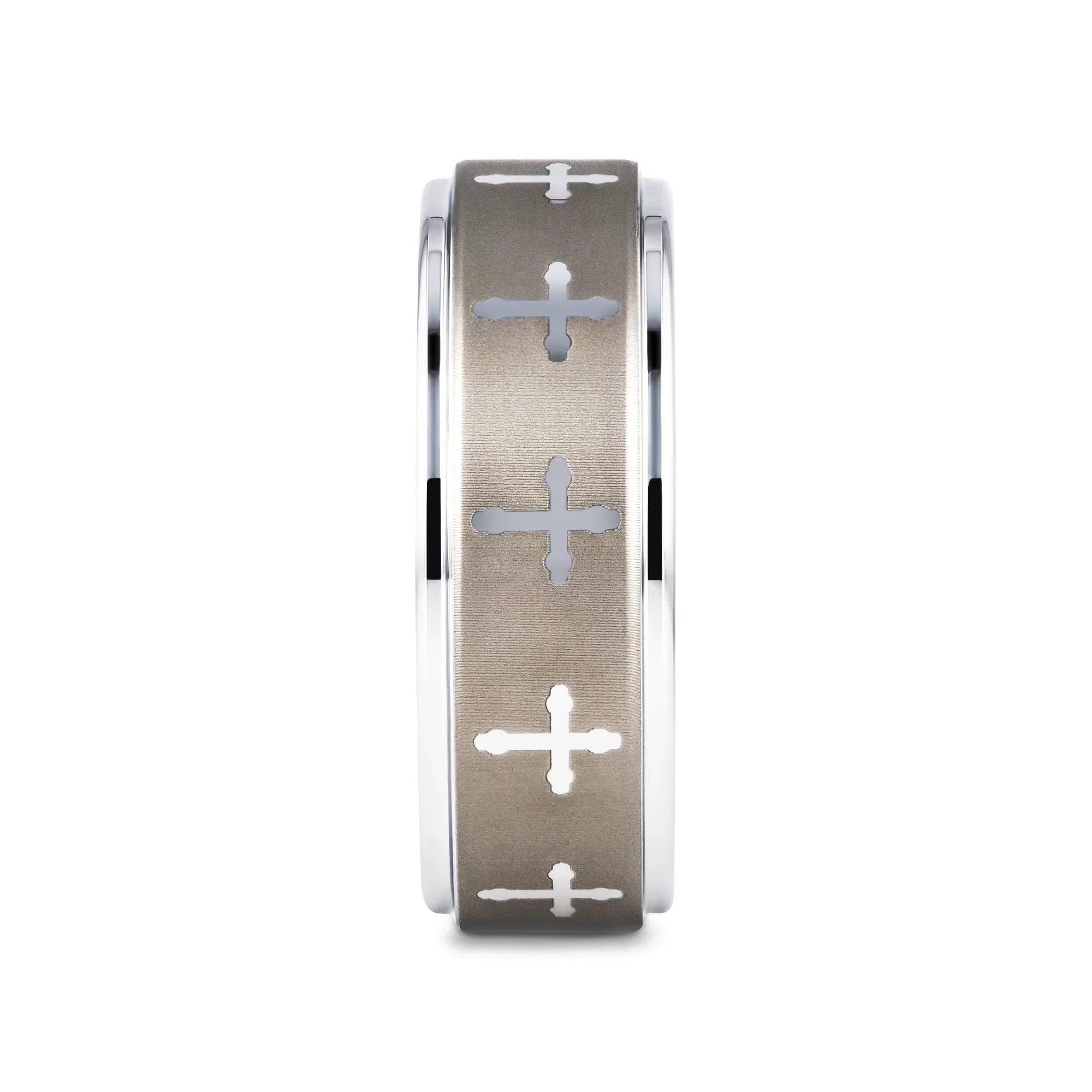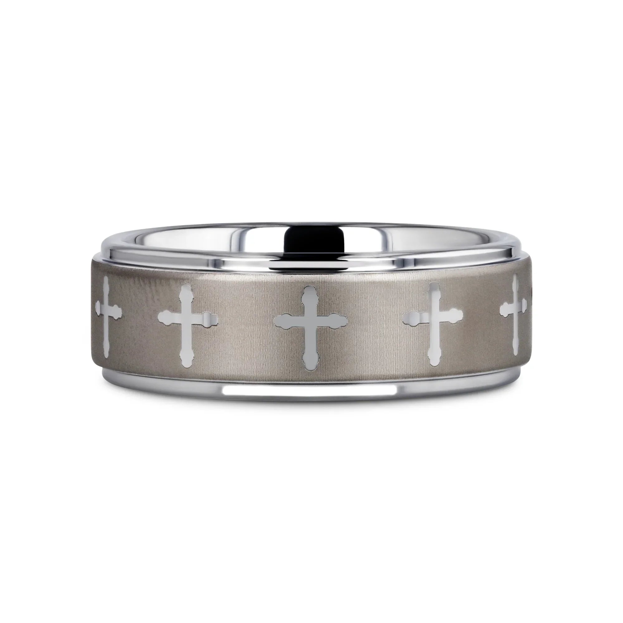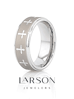 Esta alianza tiene bordes escalonados finamente pulidos y un centro elevado con cruces grabadas a láser alrededor. Puede usarse como alianza de boda o anillo de promesa.