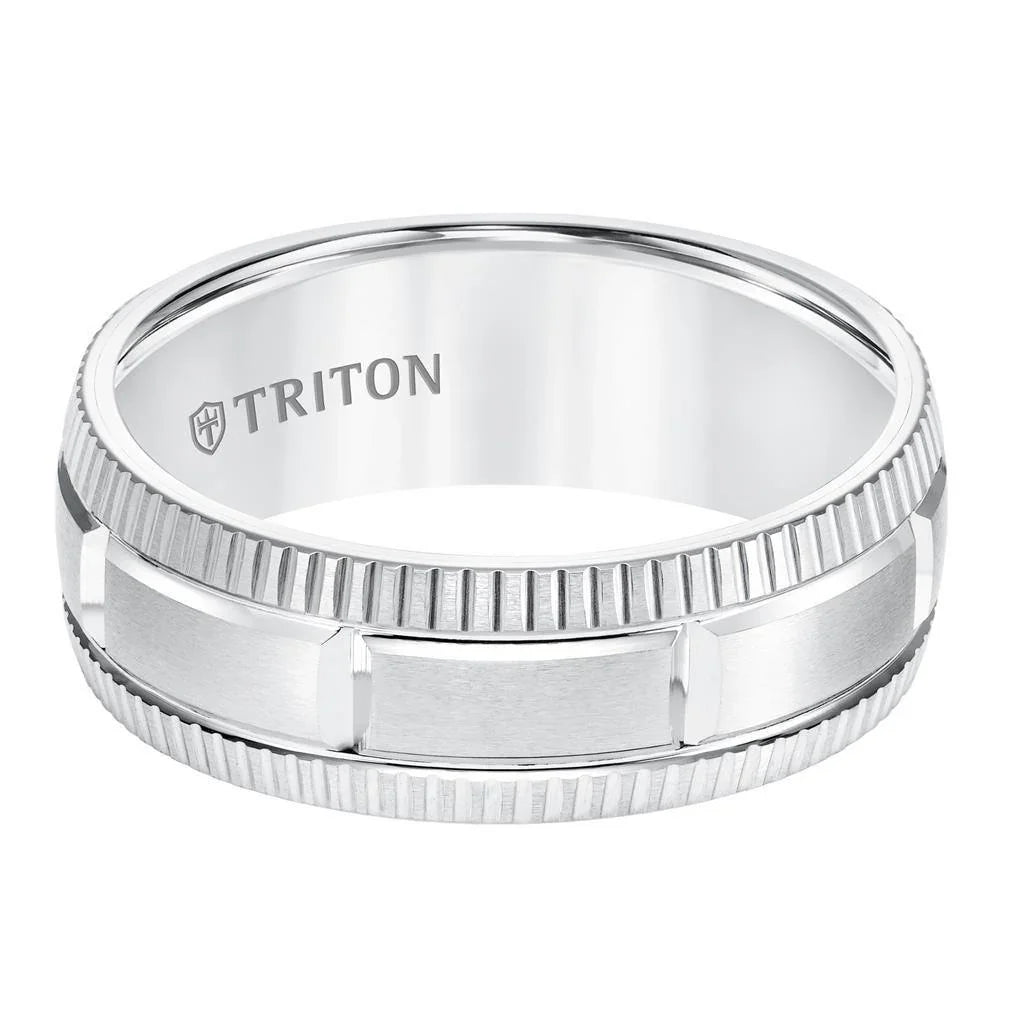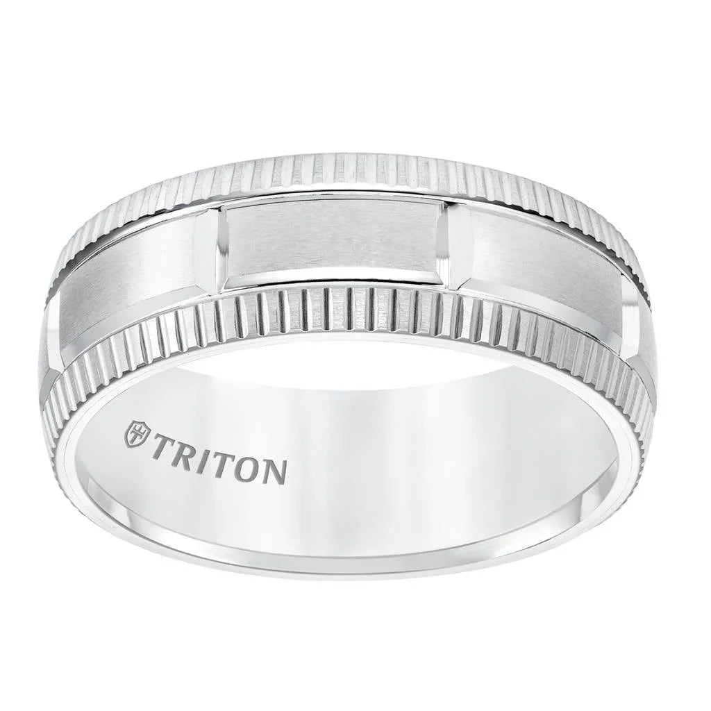 Alianza de boda ANTOLIA de tungsteno blanco satinado con borde de moneda y centro acanalado estilo ladrillo de Triton Rings - 8 mm