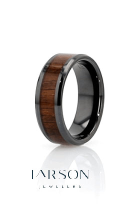 Este exótico diseño de anillo de Thorsten combina los materiales más modernos y antiguos de la joyería. Está hecho de cerámica negra de alta tecnología, resistente a los arañazos, y luce una hermosa incrustación de nogal negro oscuro de madera auténtica.
