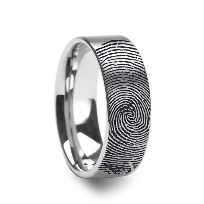 Bague Empreinte Digitale en Or Blanc 10 carats, Anneau Brossé Plat Gravé - 4 mm - 8 mm. Personnalisez cette bague de précision de notre gamme de bagues en or 10 carats brossé bombé avec votre empreinte digitale ou celle de l'être aimé. Les empreintes digitales peuvent être gravées à l'intérieur ou à l'extérieur de l'anneau, sauf mention contraire dans vos notes de commande. Cette bague est disponible en 4 mm, 6 mm et 8 mm, et peut être portée comme alliance ou bague de promesse, aussi bien par un homme que par une femme.