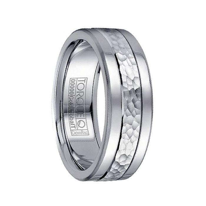 Alliance pour homme en or blanc martelé 14 carats avec incrustation de cobalt et double rainure – 7,5 mm