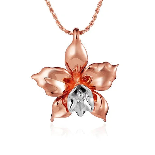 Ce collier arbore fièrement un pendentif orchidée en or rose 14 carats. Son centre est orné d'une incrustation en argent sterling. Ce magnifique bijou est accompagné d'une chaîne de 45 cm. Ce collier unique sera un cadeau idéal pour vos proches.