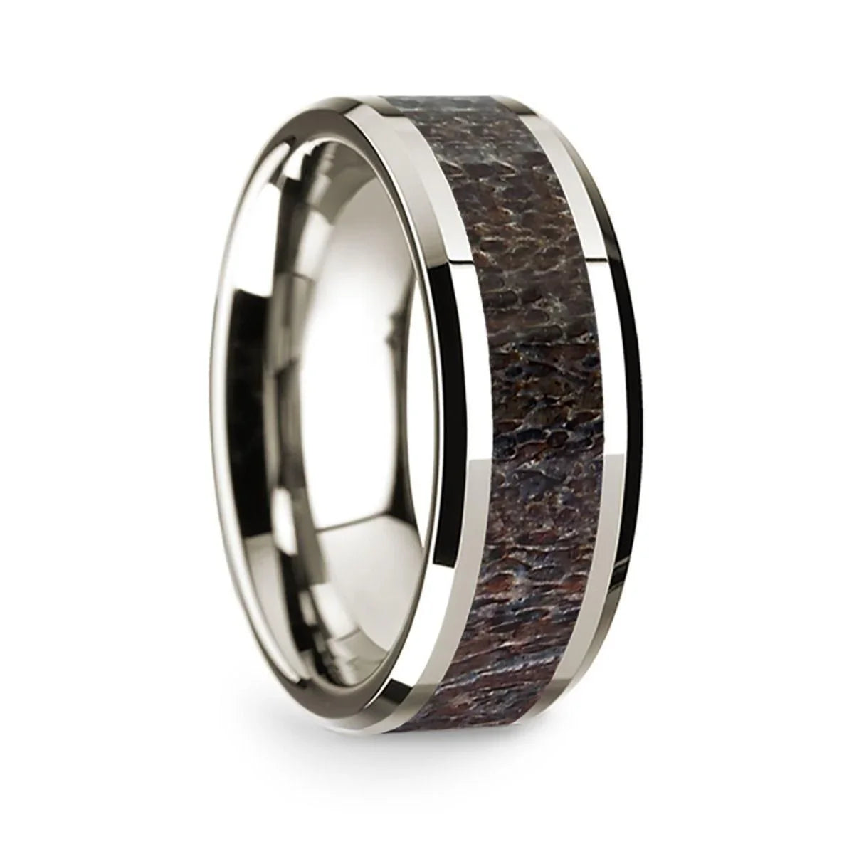 Idéale pour les amateurs de plein air, cette alliance masculine en or blanc 14 carats à profil plat et bords biseautés présente une incrustation de bois de cerf aux tons brun foncé et beige.