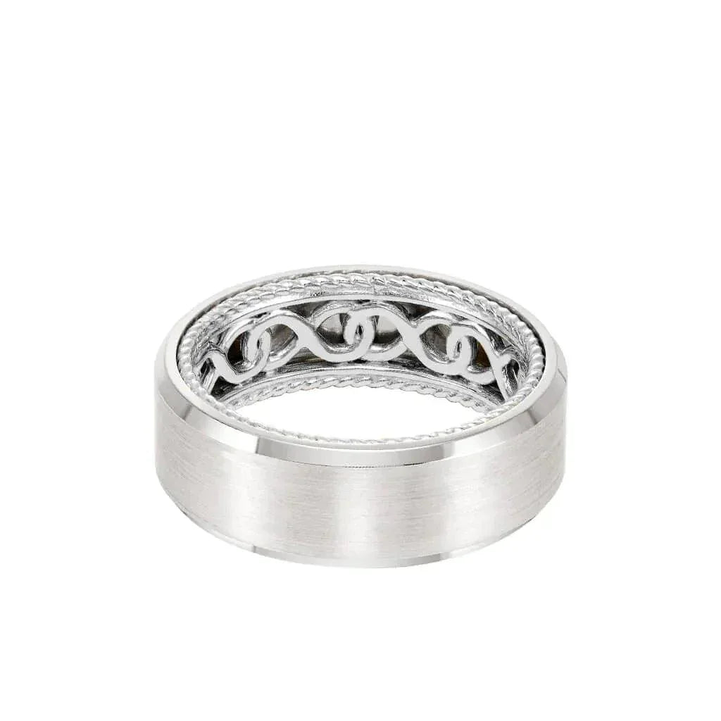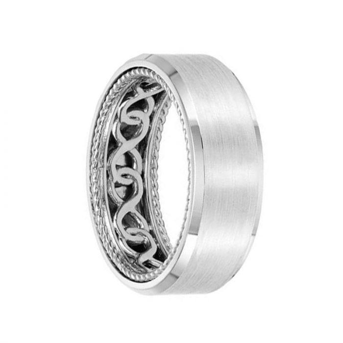 Alliance en or blanc 14 carats avec motif corde et infini, finition brossée et biseautée par Artcarved - 8 mm