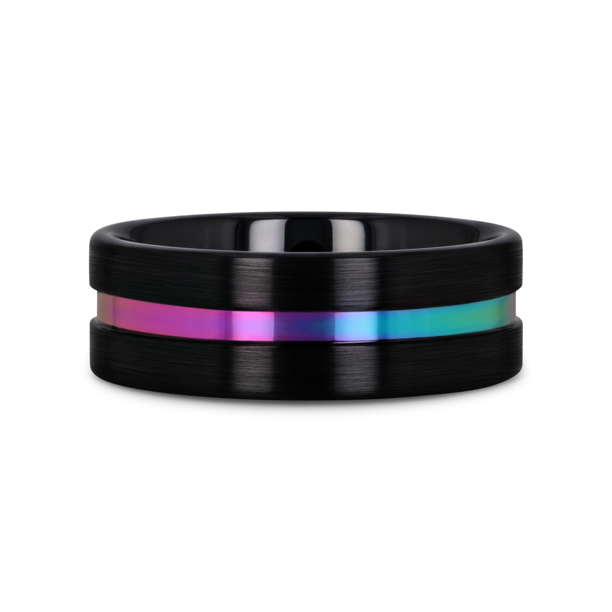 Bague AZURE en céramique noire plate brossée avec rainure arc-en-ciel - 4 mm - 8 mm
