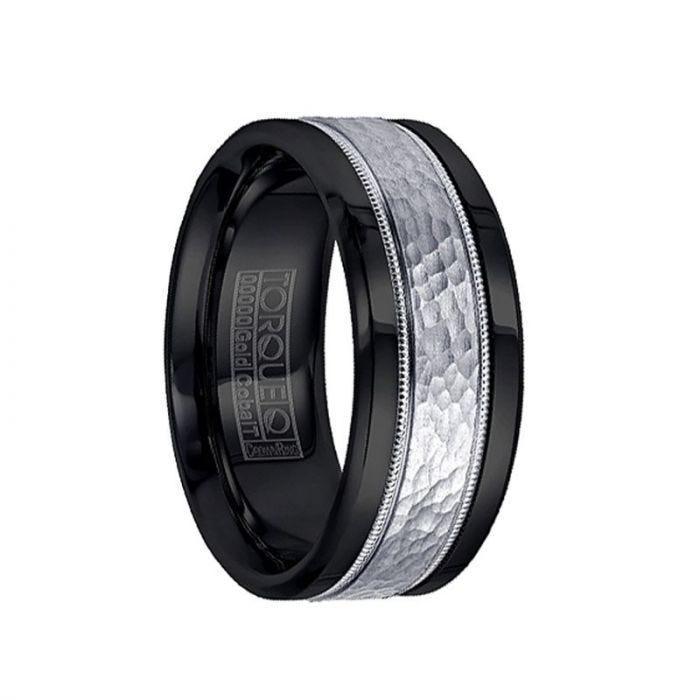 Alliance pour homme en cobalt noir avec incrustation en or blanc 14 carats martelé - 9 mm