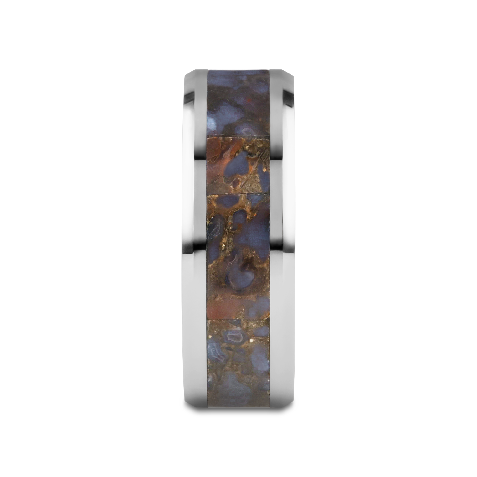 Bague à bords biseautés en carbure de tungstène incrusté d'os de dinosaure bleu DEVONIAN - 4 mm ou 8 mm