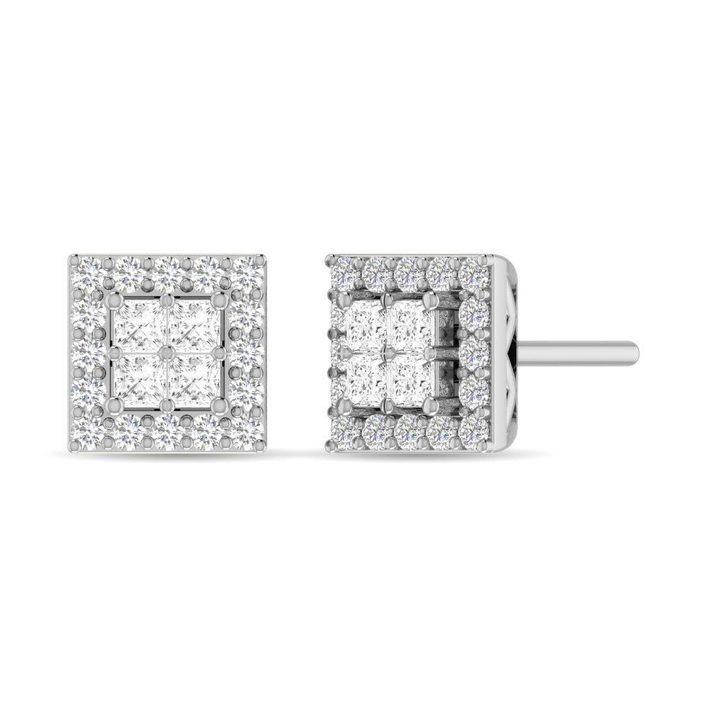 Boucles d'oreilles fantaisie en or blanc 14 carats avec diamants ronds et princesse