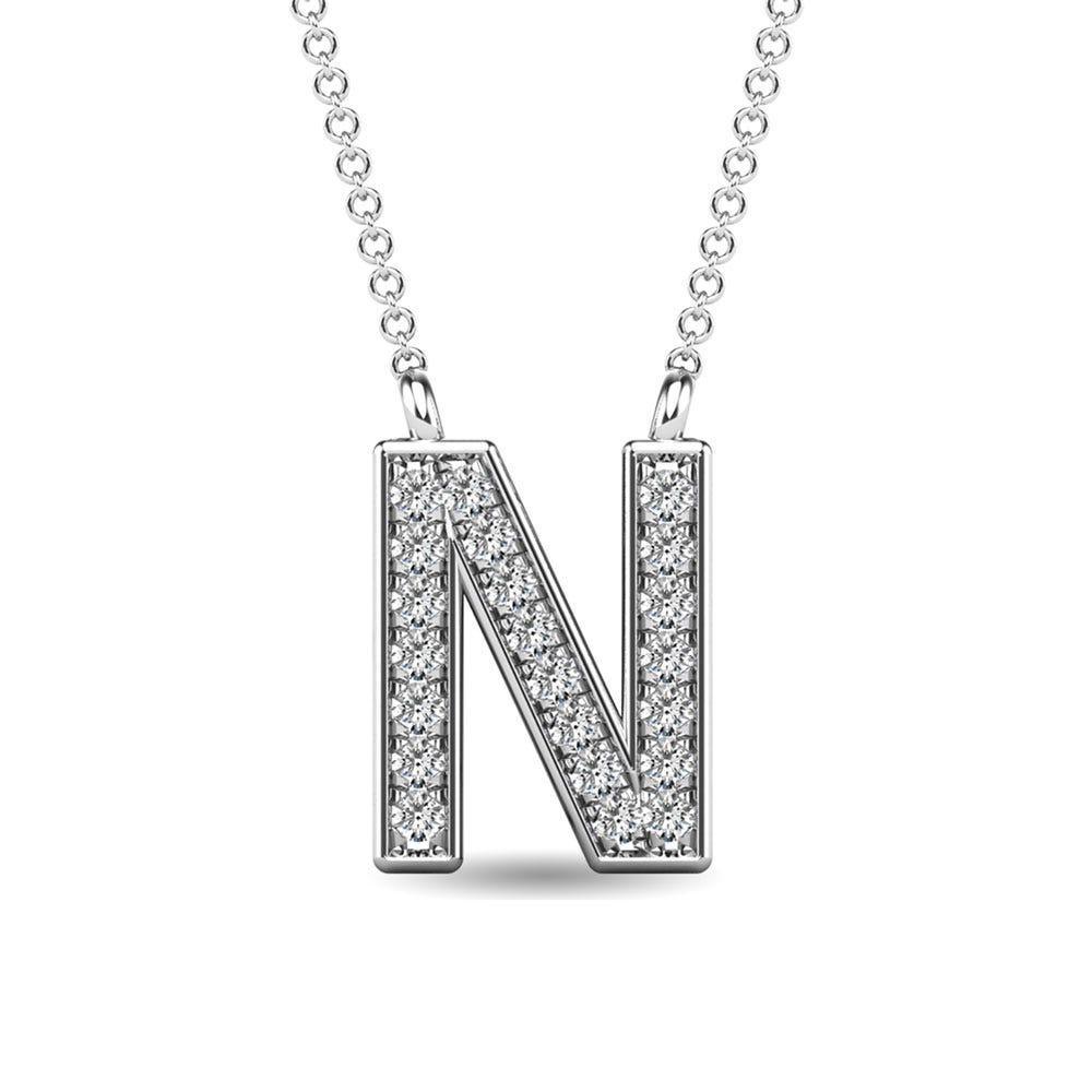 Pendentif lettre N en or blanc 10 carats, diamant 1/20 ct.
