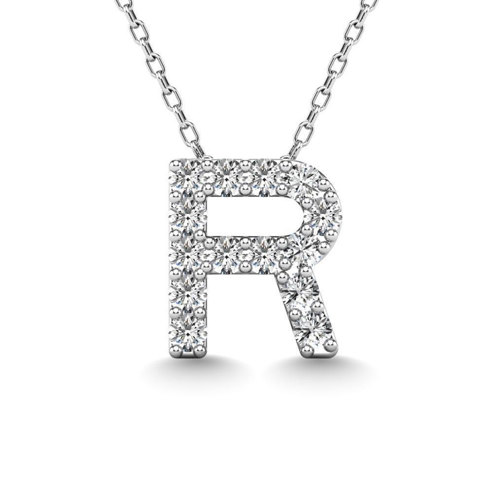 Pendentif lettre R en or blanc 14 carats et diamant de 1/8 ct.