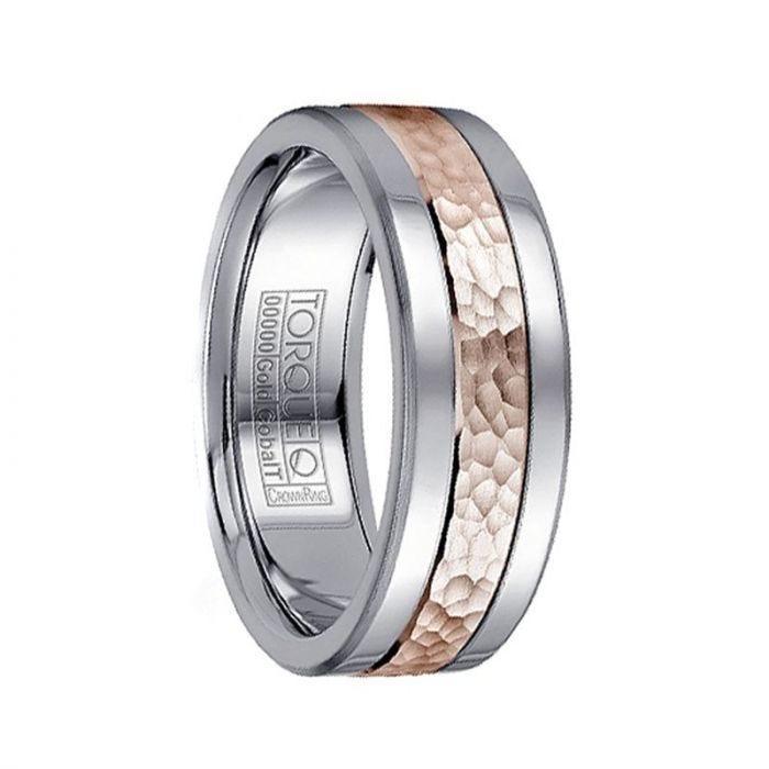 Alliance pour homme en cobalt poli à double rainure avec incrustation en or rose 14 carats martelé - 7,5 mm