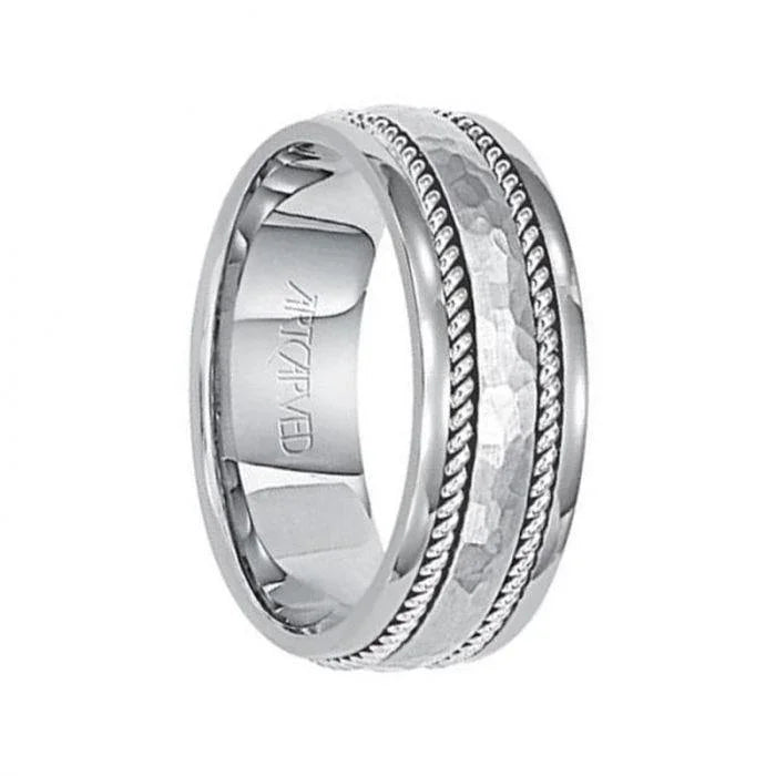 Alliance ESSEX en or blanc 14 carats, finition martelée au centre, bords roulés et motif corde, par Artcarved - 7,5 mm
