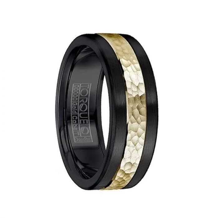 Alliance pour homme en or jaune 14 carats martelé et incrusté de cobalt noir – 7,5 mm et 9 mm