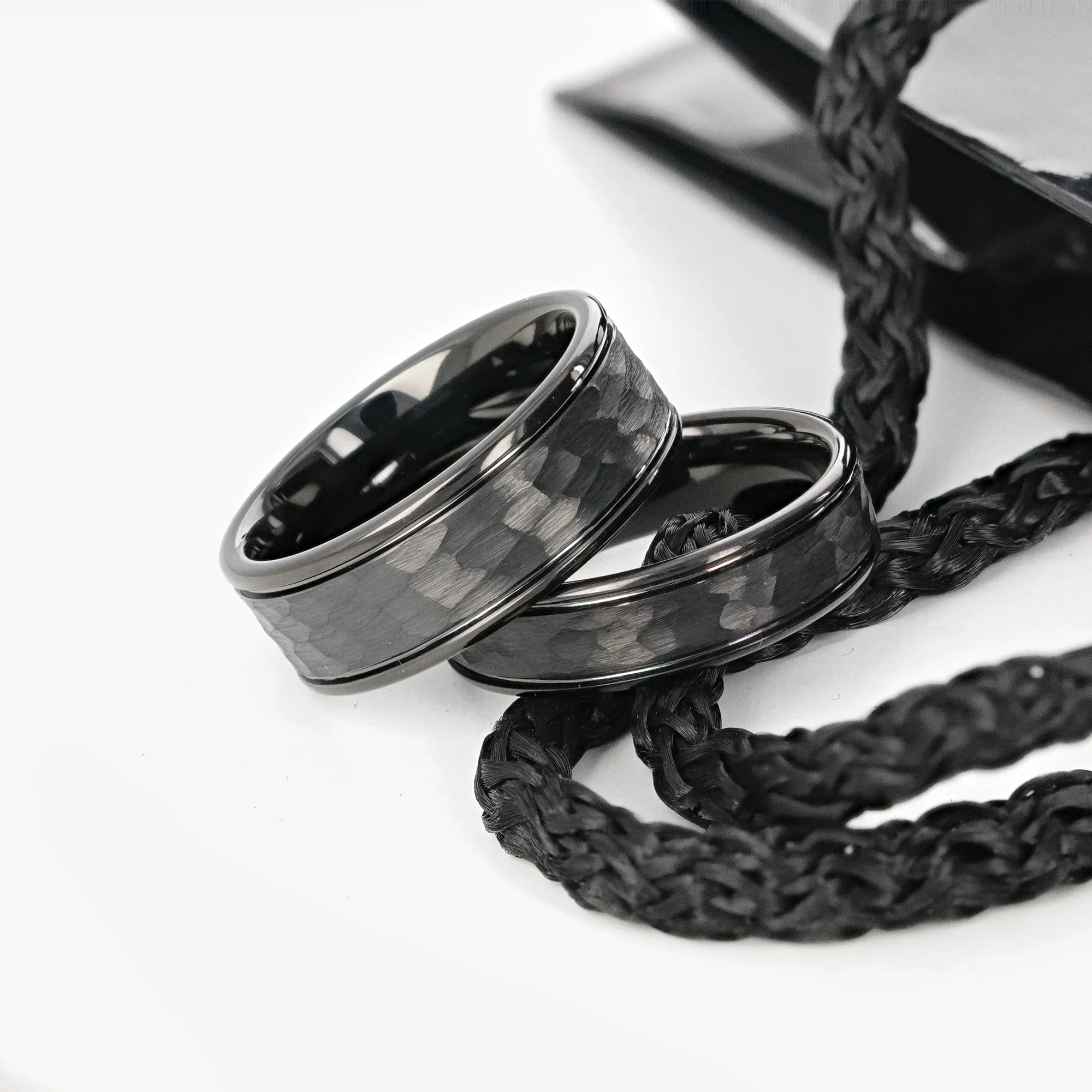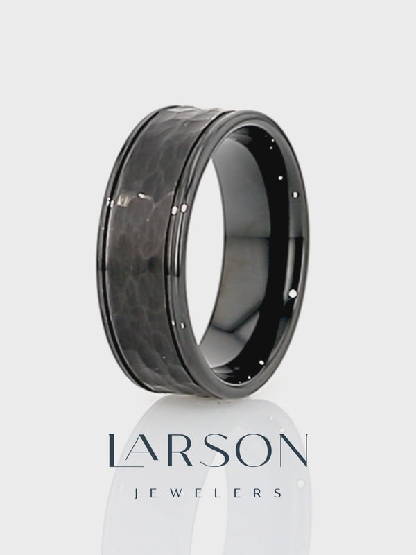 Alliance en carbure de tungstène noir avec finition martelée JOINER et bords polis - 6 mm ou 8 mm Fabriquée en carbure de tungstène noir foncé et sexy, cette bague de Thorsten a une finition martelée détaillée et des bords polis brillants avec des rainures décalées doubles et peut être portée comme alliance ou bague de promesse par des hommes ou des femmes.