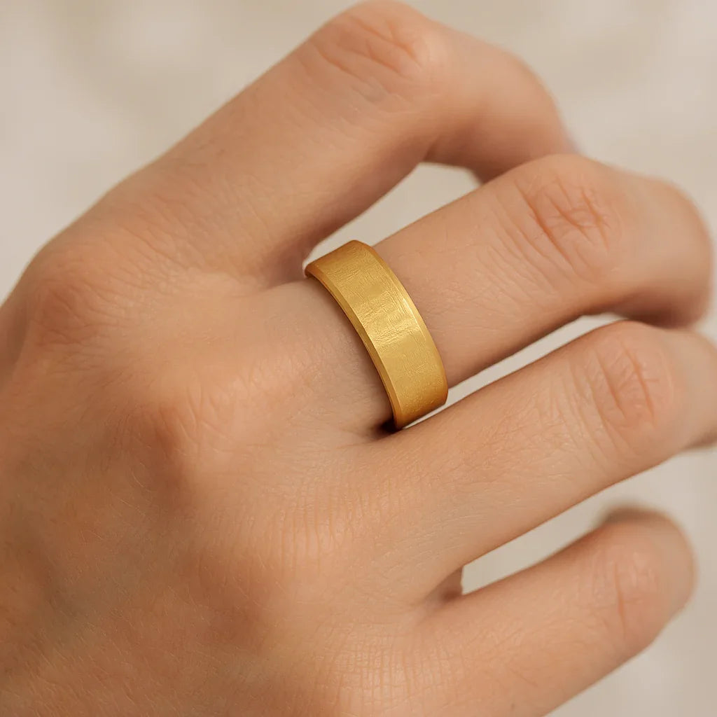 Bague MUSE en titane, alliant élégance et durabilité avec un motif météorite unique. Une bague plate biseautée, élégante et moderne, avec une luxueuse finition plaquée or.