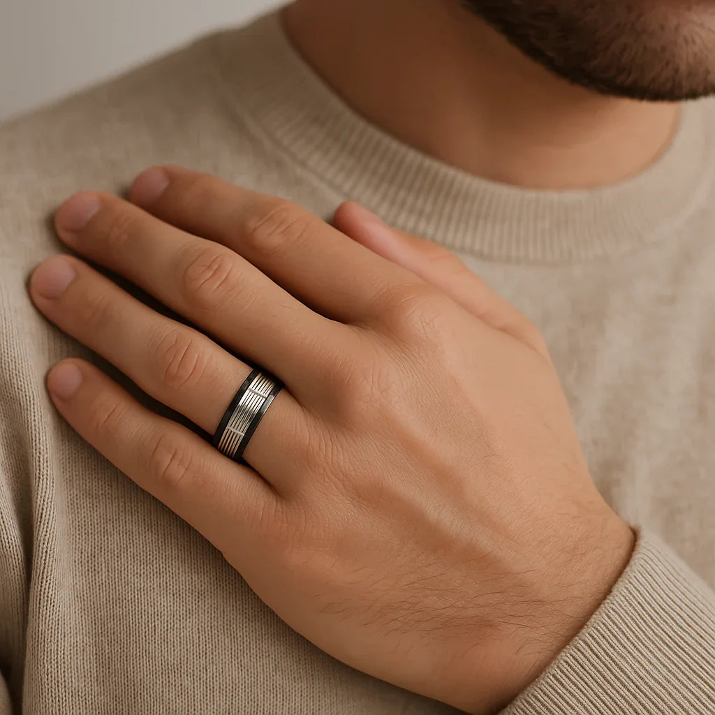 Bague de 8 mm avec extérieur en tungstène noir et découpes verticales dentelées, noyau en or blanc 14 carats